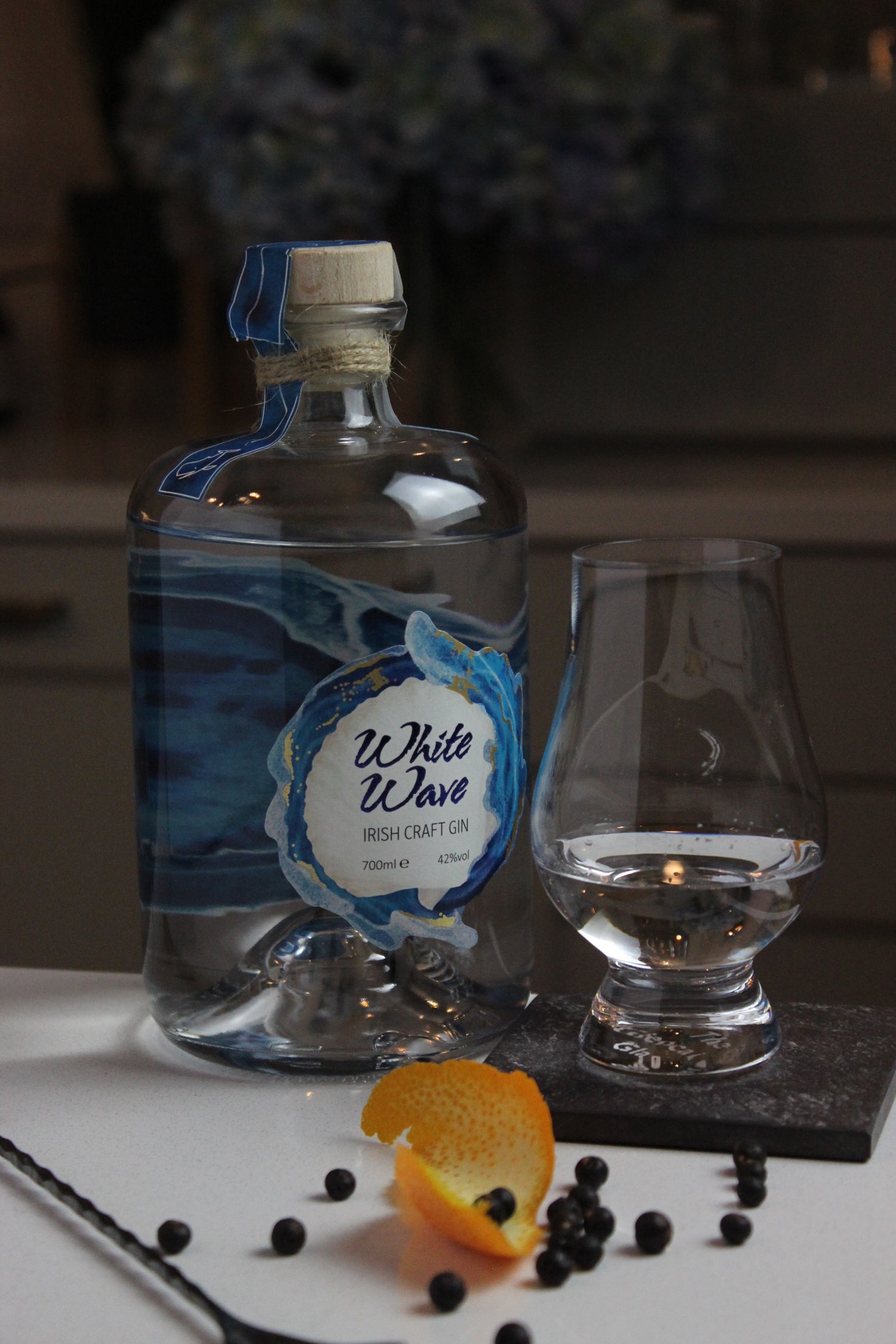 A refreshing premium Irish gin, inspired by a woman and her love for the alluring ocean and it's exhilarating crisp breeze. Bursting with hand-selected, native Irish ingredients such as Irish honey and a pinch of sea salt, White Wave Gin withholds an exceptional quenching citrus taste and sweet aroma's. The infusion of natural botanicals balances the zest of orange which composes a distinct but refreshing aftermath.